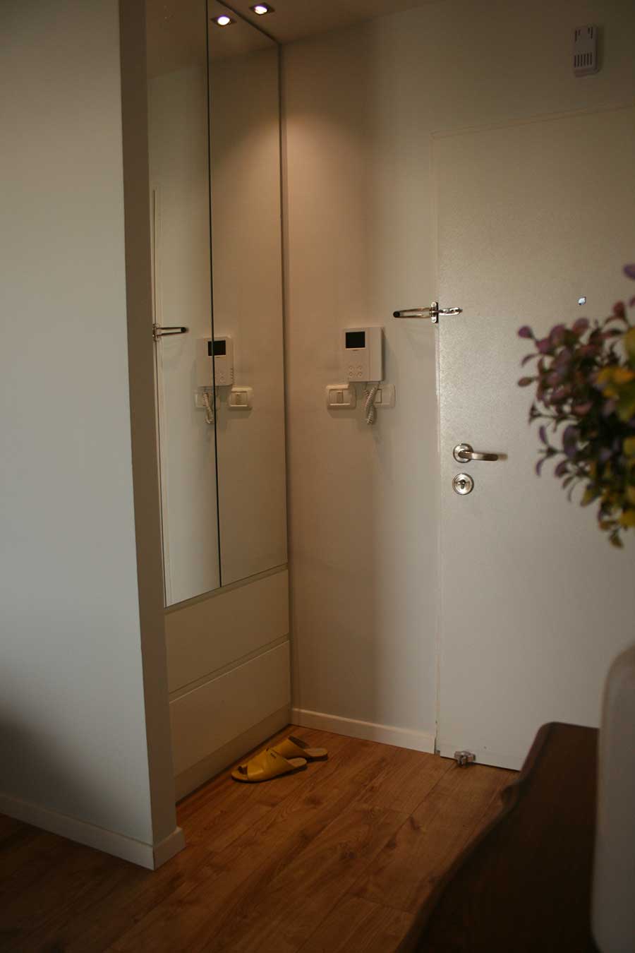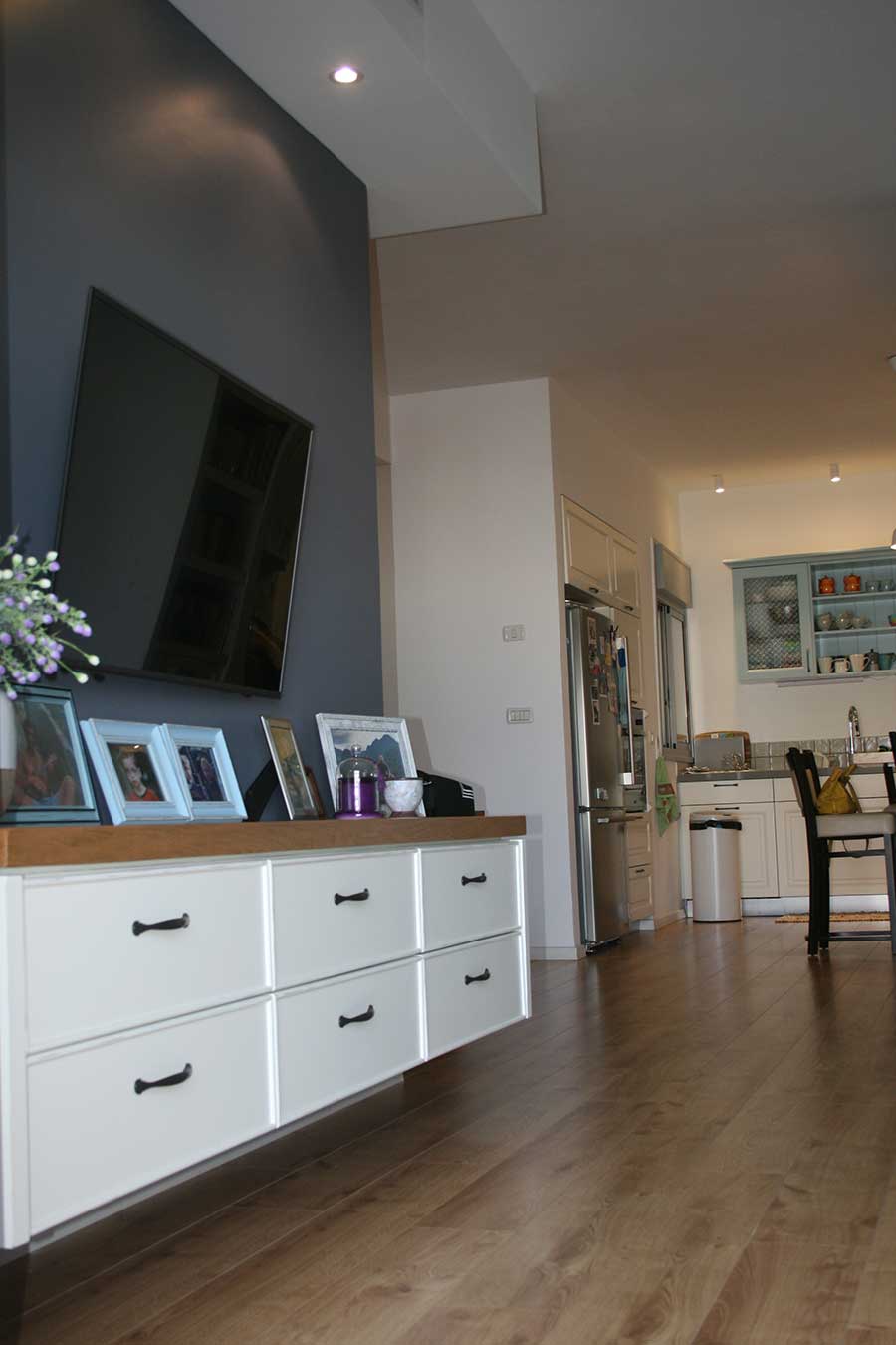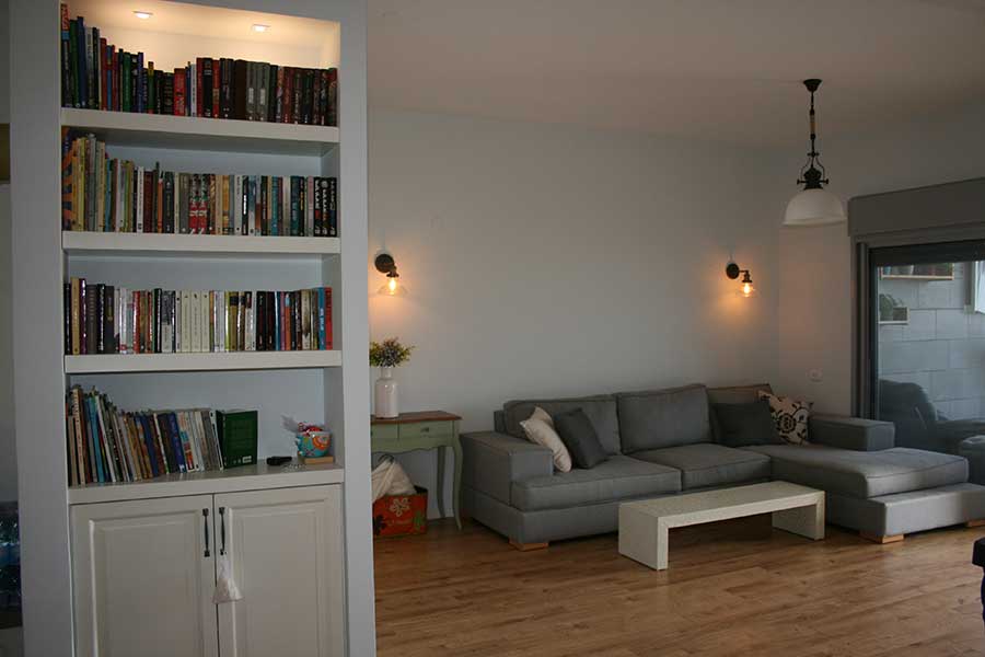 השינוי המשמעותי הראשון לחיים, בוצע בהוספת אזור אחסון בכניסה. לצערי, זה בא על חשבון חלל המגורים הפתוח. דלת הכניסה נפתחת ופוסעים לסלון הפתוח לפינת האוכל ולא ניתן היה למקם ארון כניסה מאחורי הדלת או בנישה קיימת קרובה. לכן, הוספנו קובייה של קירות גבס בגודל של כ-1 מ"ר מימין לכניסה. בצד הפונה לדלת נוצרה נישה המתאימה לארון כניסה בנגרות ומהצד השני של הקובייה מוקמה ספרייה דקורטיבית עם מדפים וארונית, גם בנגרות בהזמנה, עם תאורת לד מובנית בכל צד.
