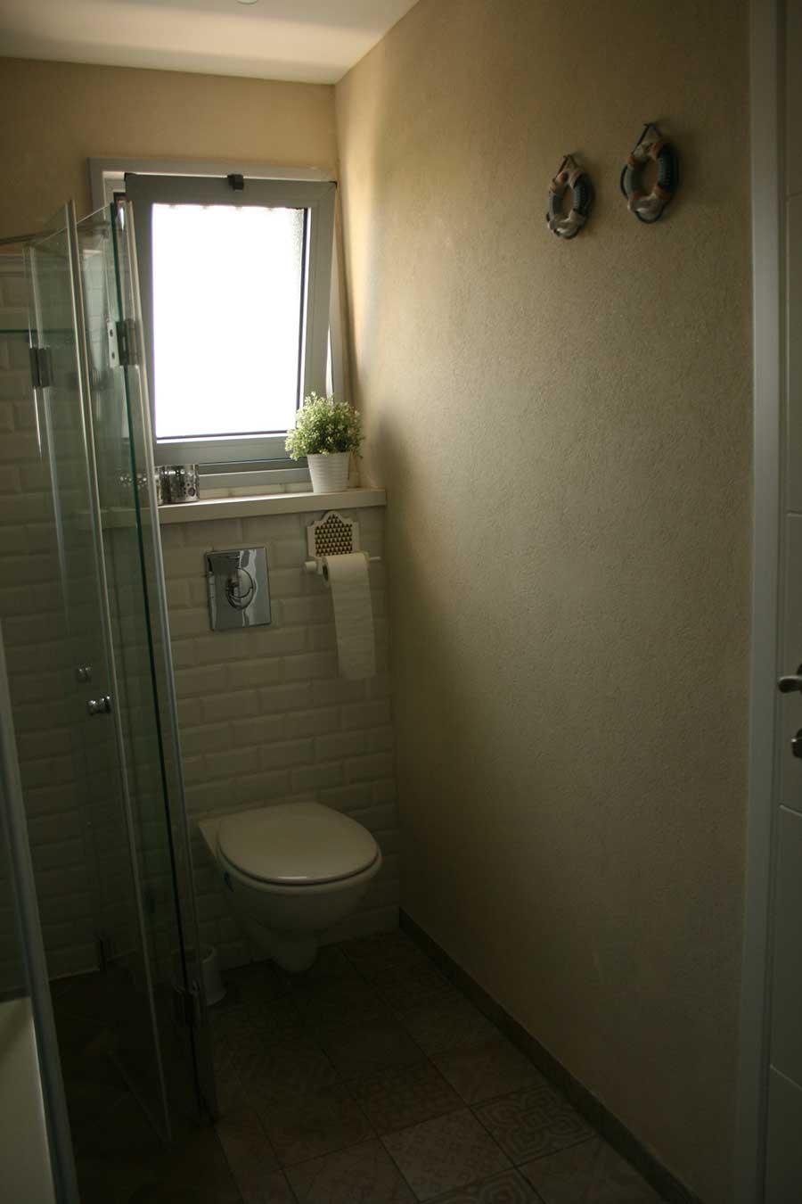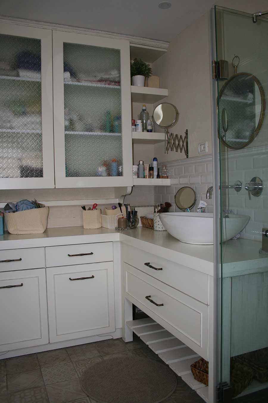 אזור נוסף מטופל בקפידה היה חדרי המקלחת המשפחתי והאישי. בחדר המקלחת המשפחתי תוכננה נישה לכביסה ומקלחון זכוכית נוח (הצד השני של המקרר). בחדר המקלחת האישי, תוכננה נגרות לשידת מגירות מפנקת בחדר השינה ולארון אמבטיה ומידוף בהתאמה אישית. בשניהם הוספה תקרת גבס לשילוב תאורת לד.